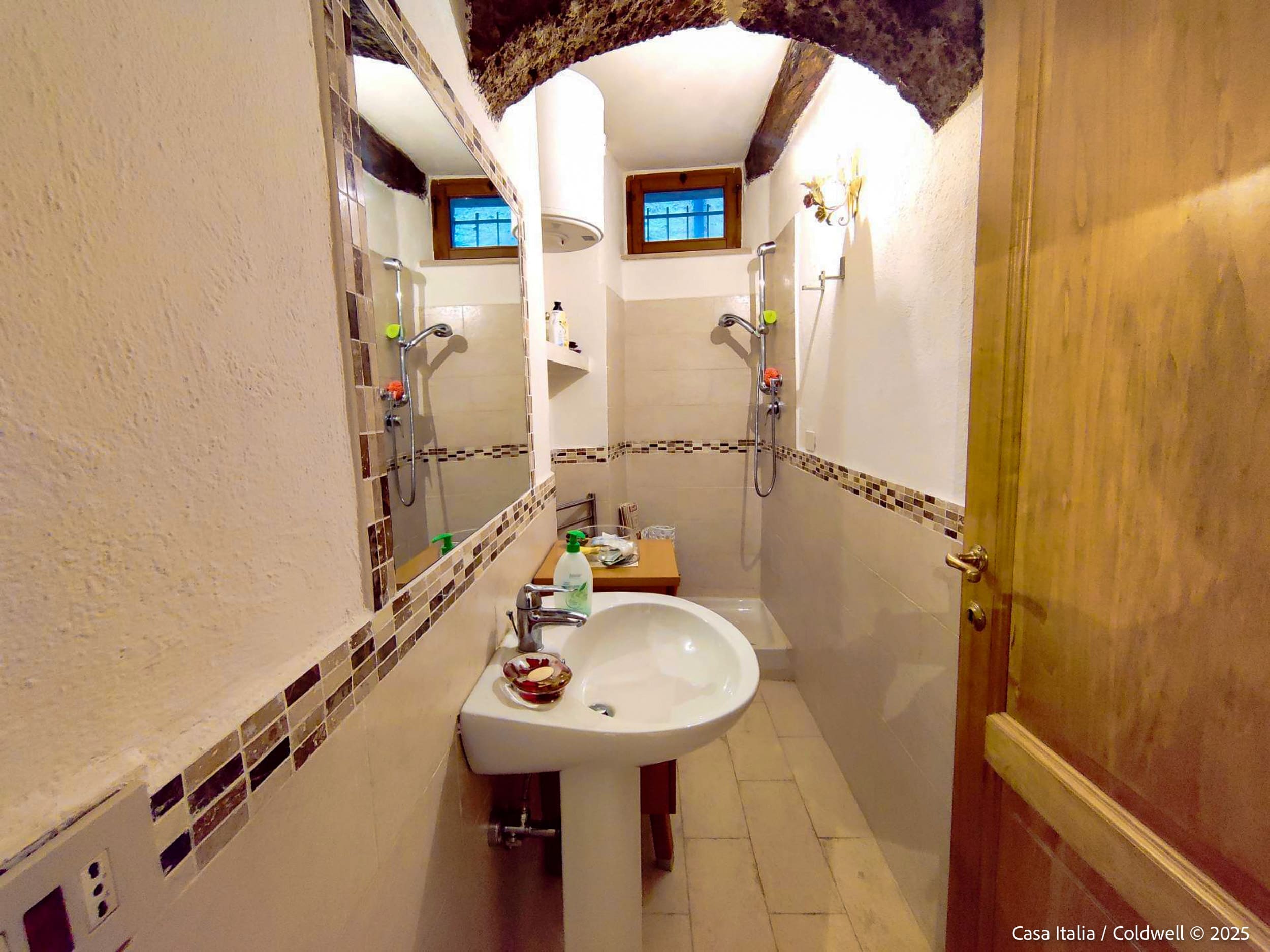 Du kommer inn i et koselig, tradisjonelt kjøkken. Den innebygde kjøkkenløsningen i mur har åpne hyller og gir rommet en autentisk karakter. Her er det plass til spisebord, og vinduet vender ut mot en rolig gate. I denne etasjen ligger også et funksjonelt baderom med dusj.
