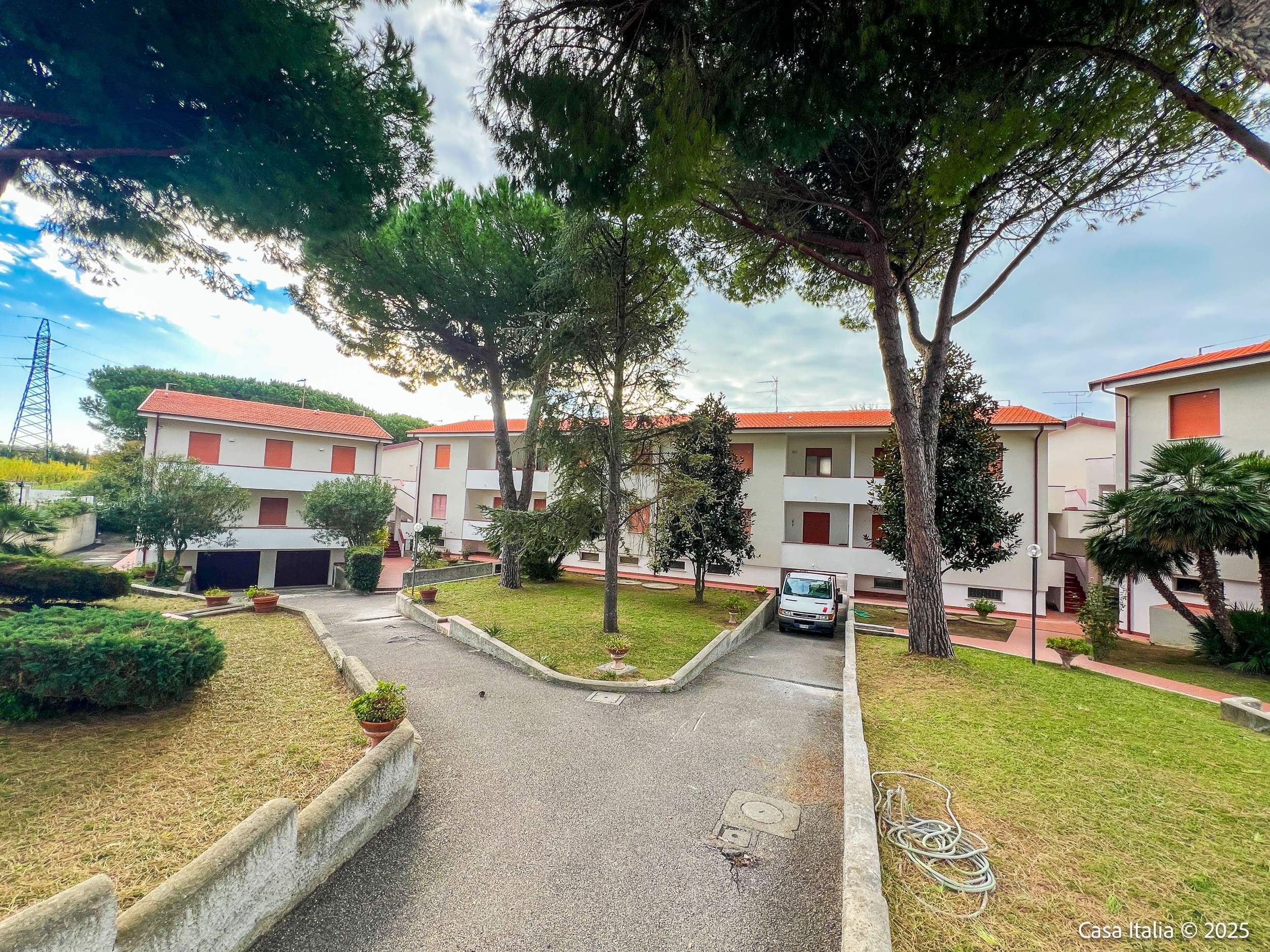 Leiligheten ligger i 2. etasje (toppetasjeen) i et velholdt boligkompleks omgitt av pinjetrær og felles grøntarealer. Bygningen har nylig gjennomgått utvendige oppgraderinger med etterisolering av tak og yttervegger (og ny, lysere maling), noe som gir bedre energieffektivitet og komfort.