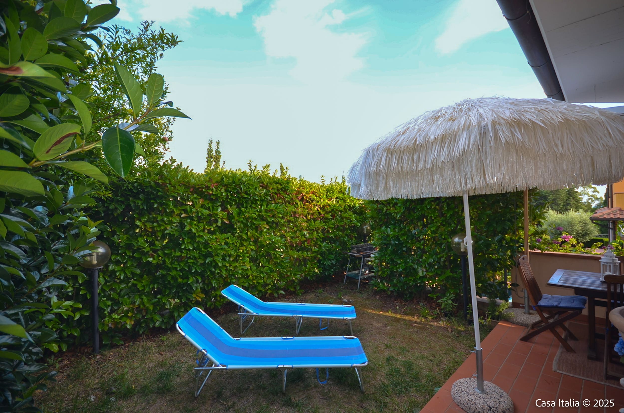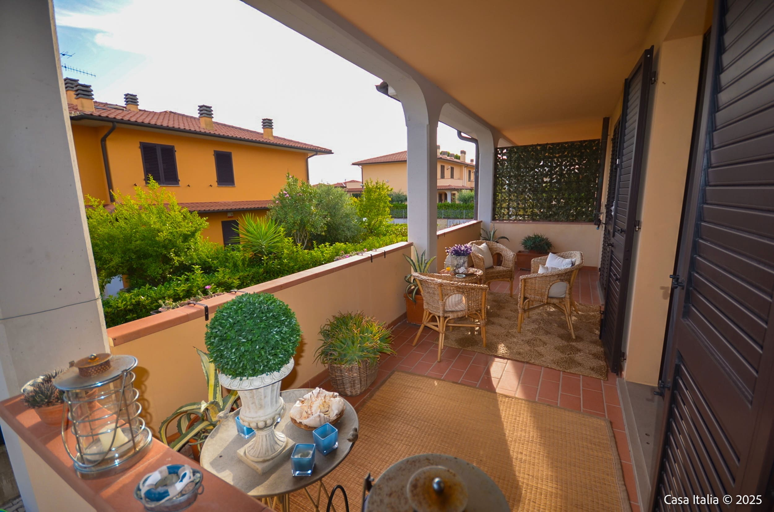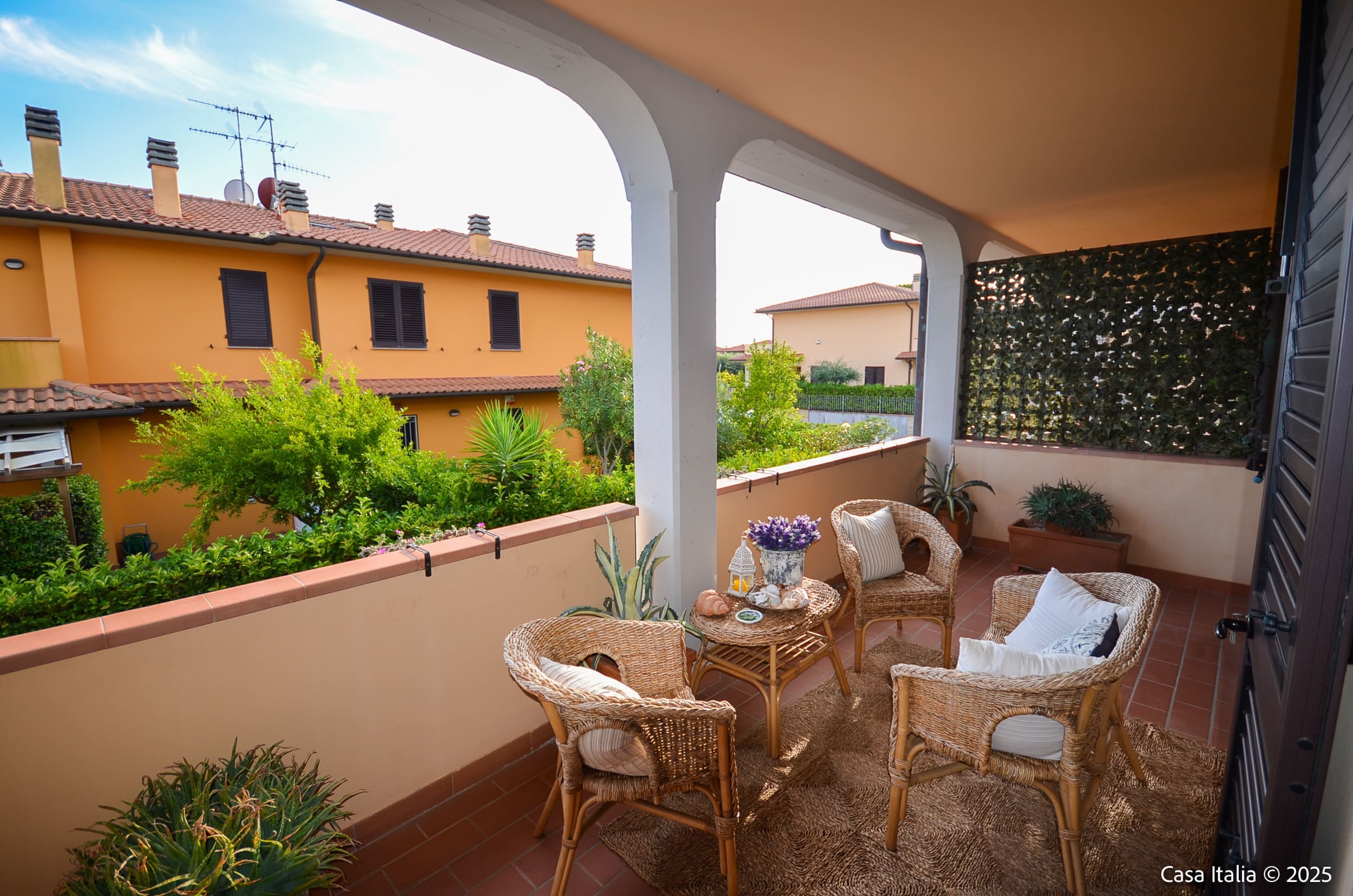 Beplantningen er typisk for Toscanakysten med lave busker, prydbed og plass for urtepotter.