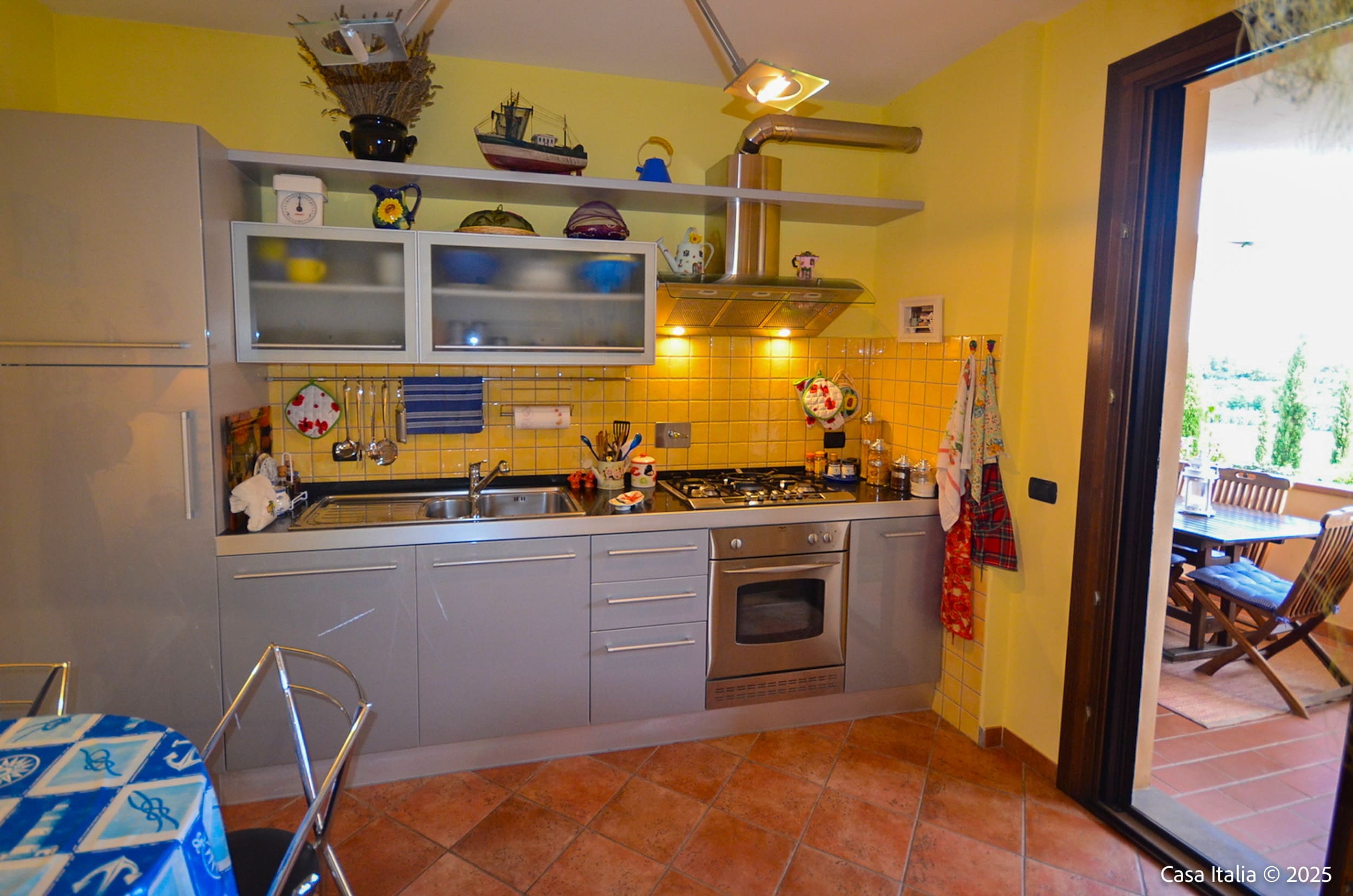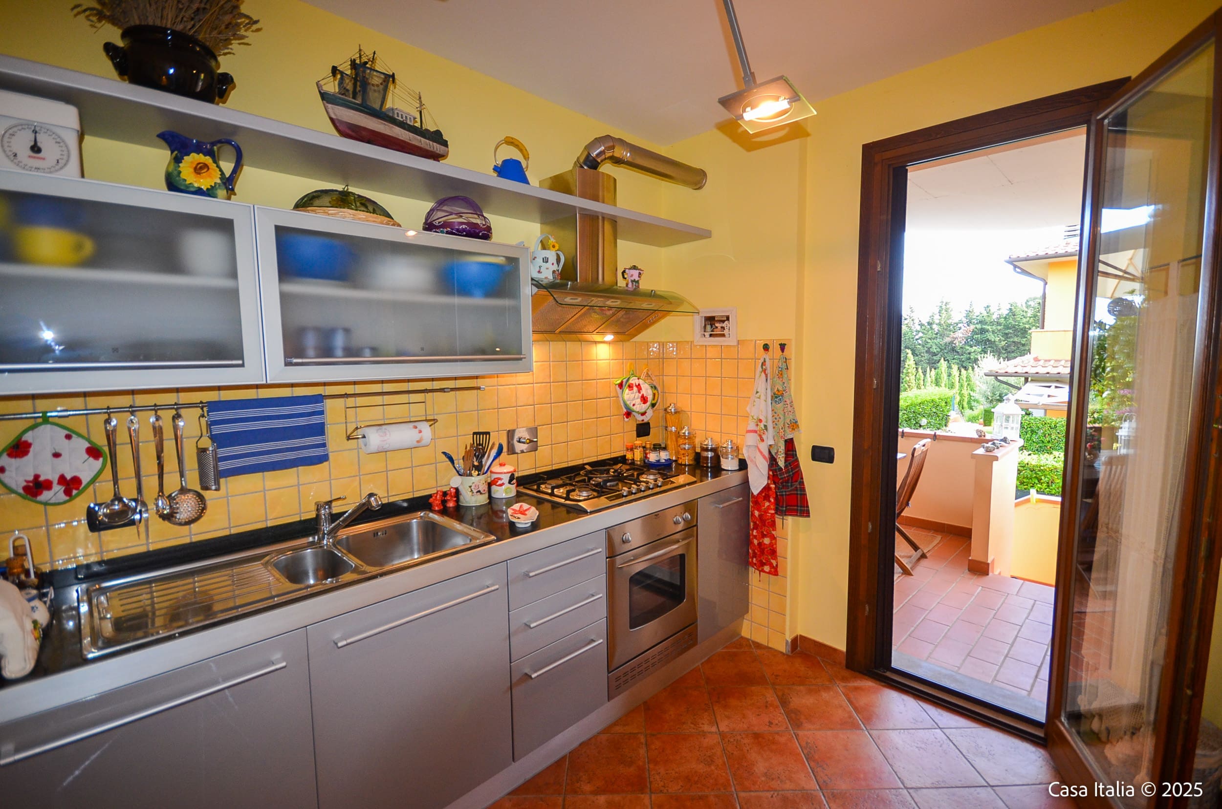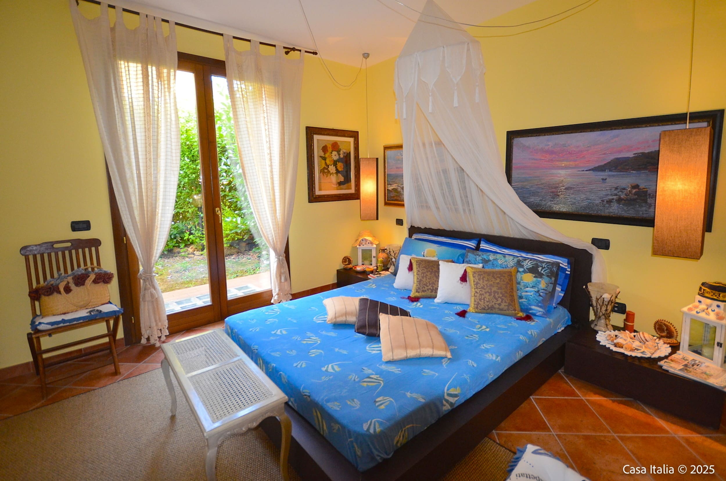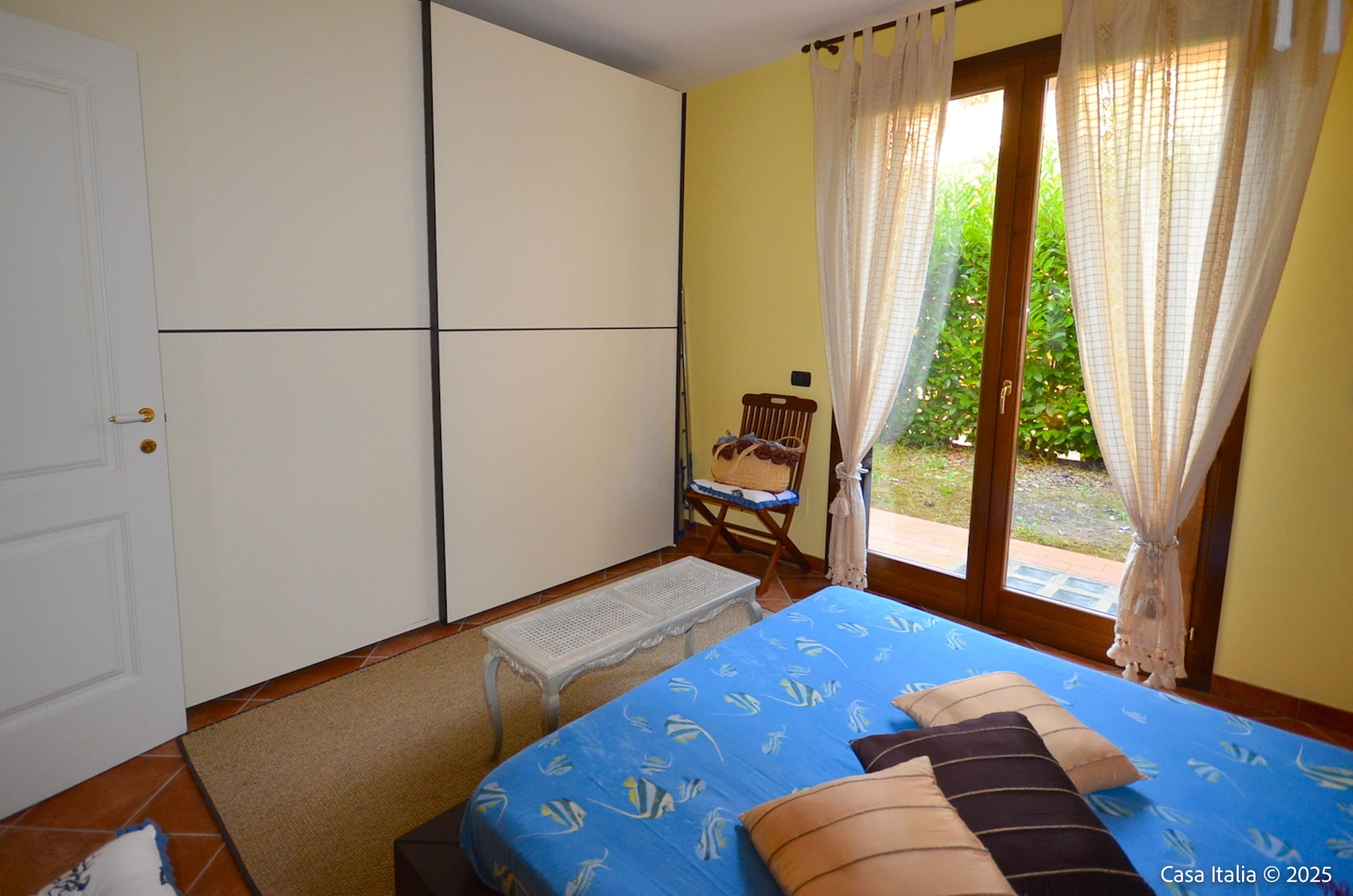 Beplantningen er typisk for Toscanakysten med lave busker, prydbed og plass for urtepotter.