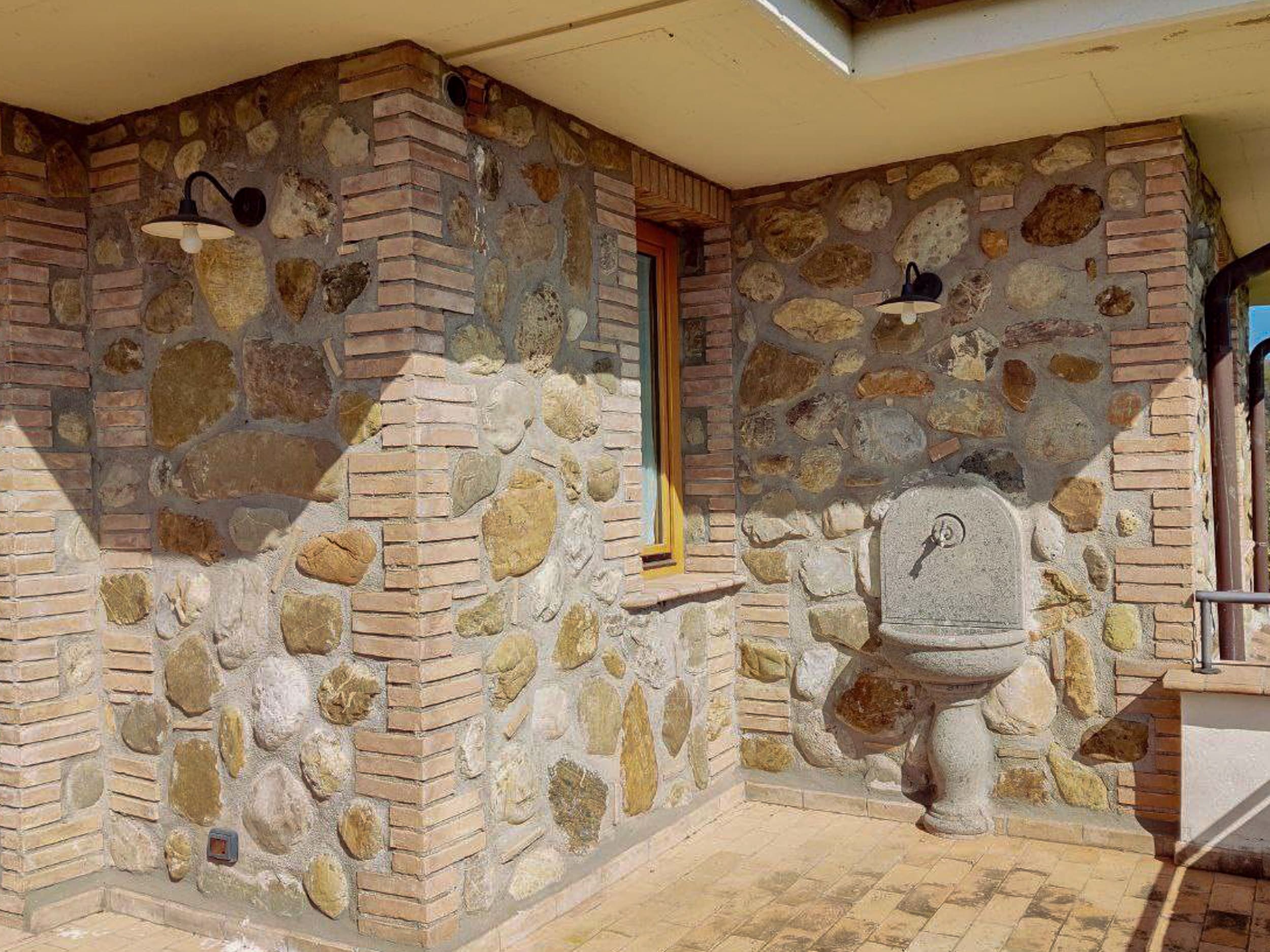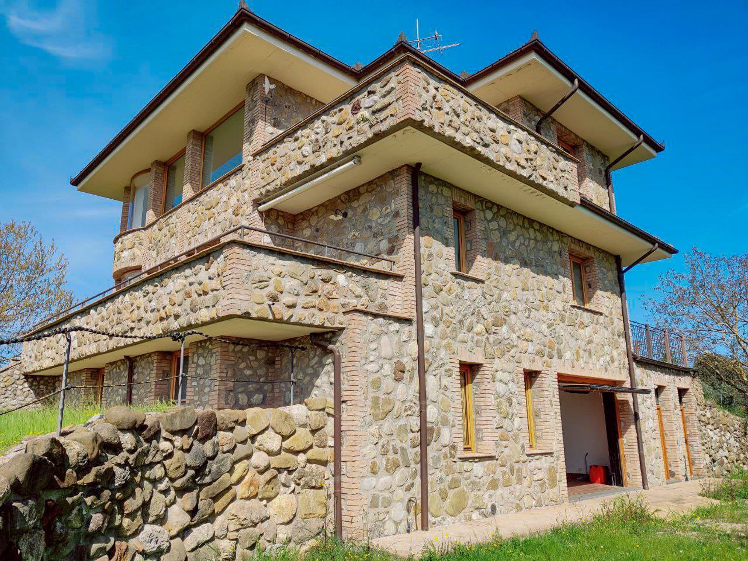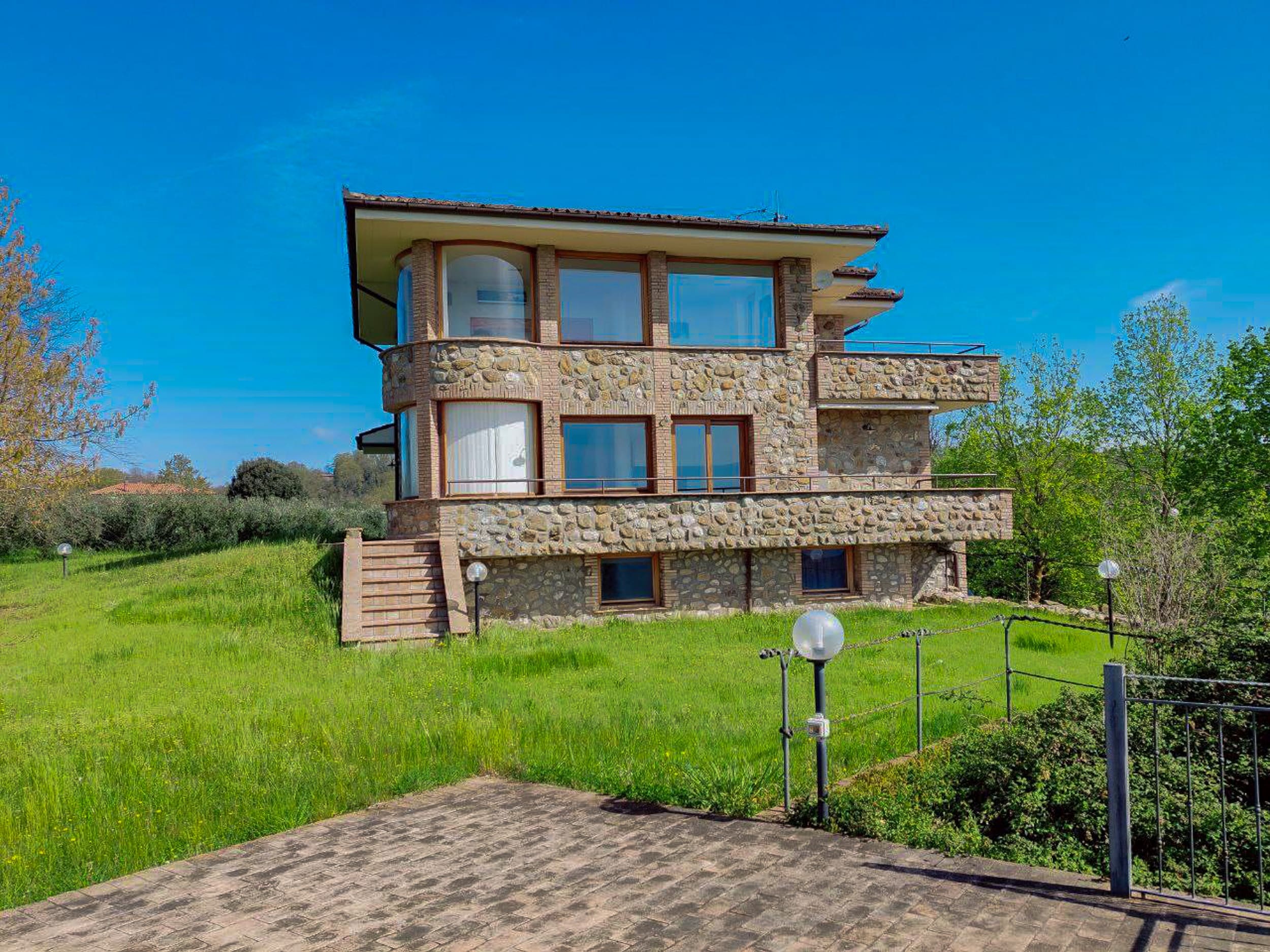 Utvendig er villaen steinsatt med en unik type vulkansk stein fra Paglia-elven, som sammen med de store panoramavinduene gir bygget et særegent preg.